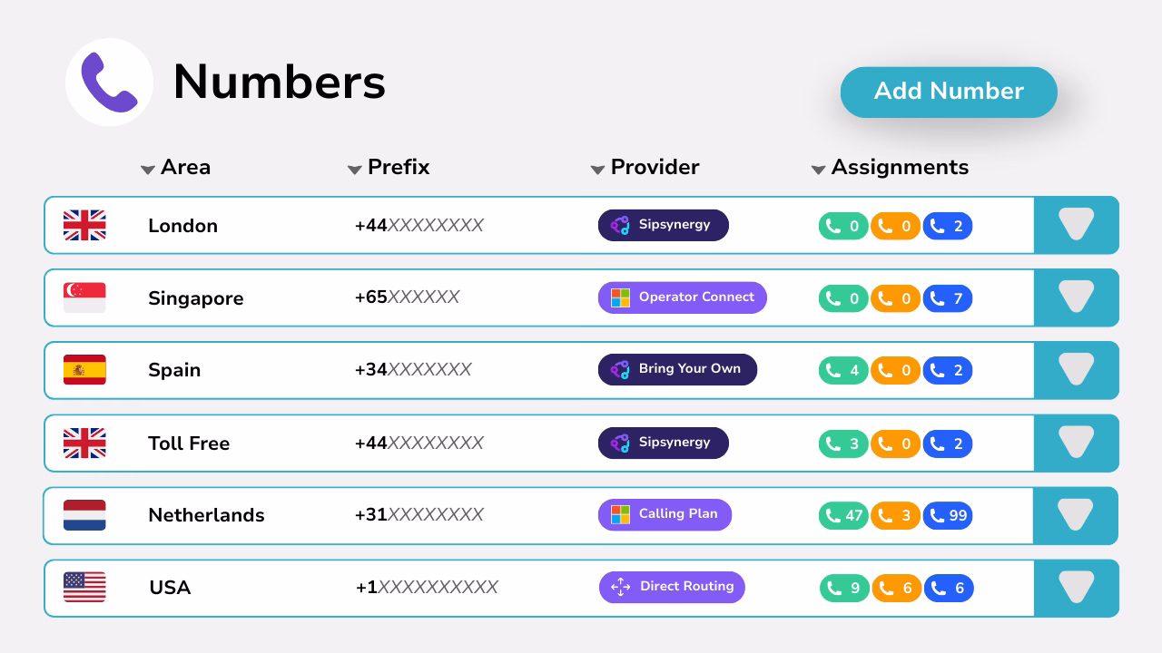 Callroute makes it effortless to route phone numbers to the service of your choice — Microsoft Teams, Webex, existing PBXs, contact centres and more. Assign individual numbers or update entire ranges in bulk in just a few clicks.